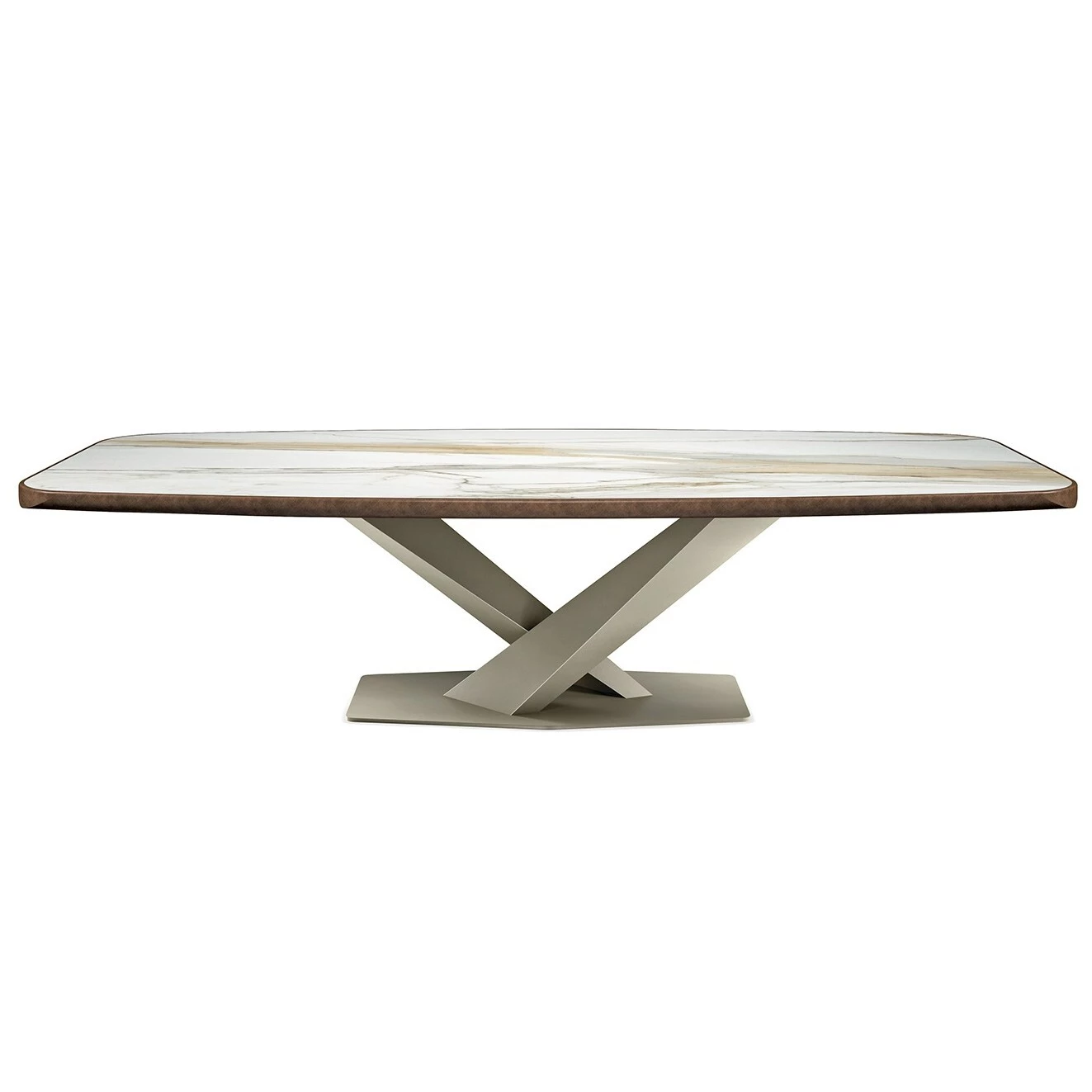 Stół z podstawą z tytanu (GFM11), brązu (GFM18), grafitu (GFM69) lub czarnej (GFM73) lakierowanej stali. Blat ceramiczny Marmi Alabastro (KM02), Supreme (KM03), Ardesia (KM04), matowy Golden Calacatta (KM05), błyszczący Golden Calacatta (KM06), matowy Portoro (KM07), błyszczący Portoro (KM08), błyszczący Sahara Noir (KM09), Emperador (KM10), Makalu (KM11), Breccia (KM12) lub Arenal (KM13) z lakierowanym szczotkowanym brązem lub szarym dolnym profilem zaokrąglonym. Blat o grubości 6cm w wersji 300x128 i 5cm w wersjach 200x120 i 240x120.