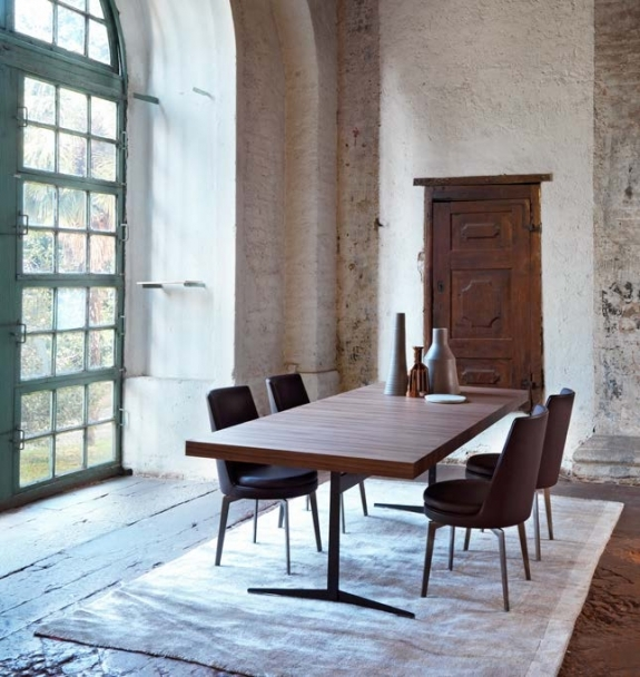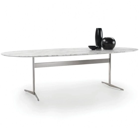 Rozległa rodzina niezwykle wszechstronnych stołów, stolików kawowych, stolików bocznych i szaf, Fly to autentyczne wyrażenie rodzaju "dobrego projektu", na którym opiera się cała kolekcja Flexform. Czystość projektu, wraz z prawdziwą praktycznością i różnorodnością dostępnych wykończeń i rozmiarów, nadają stołowi Fly niesamowitą wszechstronność. Metalowa podstawa stołu występuje w wykończeniu satynowym, chromowanym, wypalanym, czarnym chromem lub w kolorze szampańskim, podczas gdy blat - dostępny w kształcie okrągłym, owalnym lub prostokątnym, i w kilku rozmiarach - występuje w fornirze orzecha Canaletto lub jesionu, barwionym w różnych odcieniach, lub w marmurze. Dostępna jest również wersja rozkładana stołu prostokątnego.