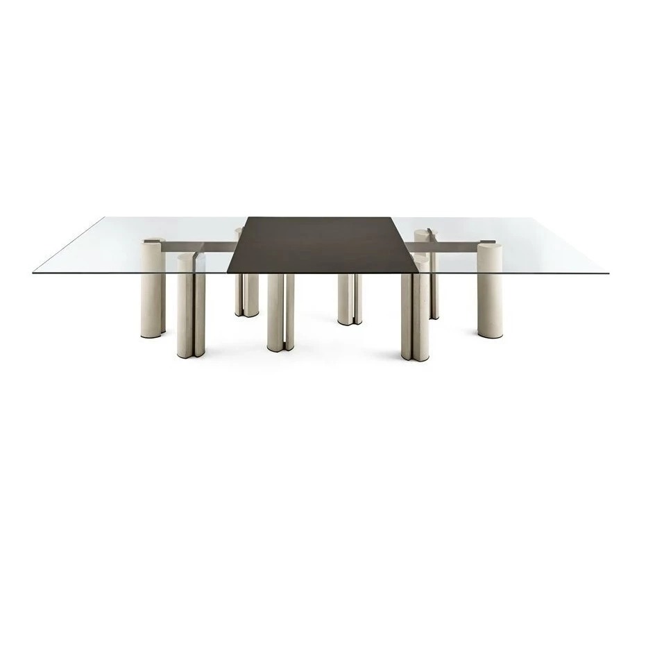 Stół z blatem ze szkła hartowanego o grubości 12 mm, dostępny w wersji ekstralight, "Grigio Italia" lub pomalowany w ekskluzywnym antycznym brązie lub ołowiu. Podstawy w jasnym lub ciemnym betonie lekkim. Części metalowe w lakierowanym metalu w kolorze błota.