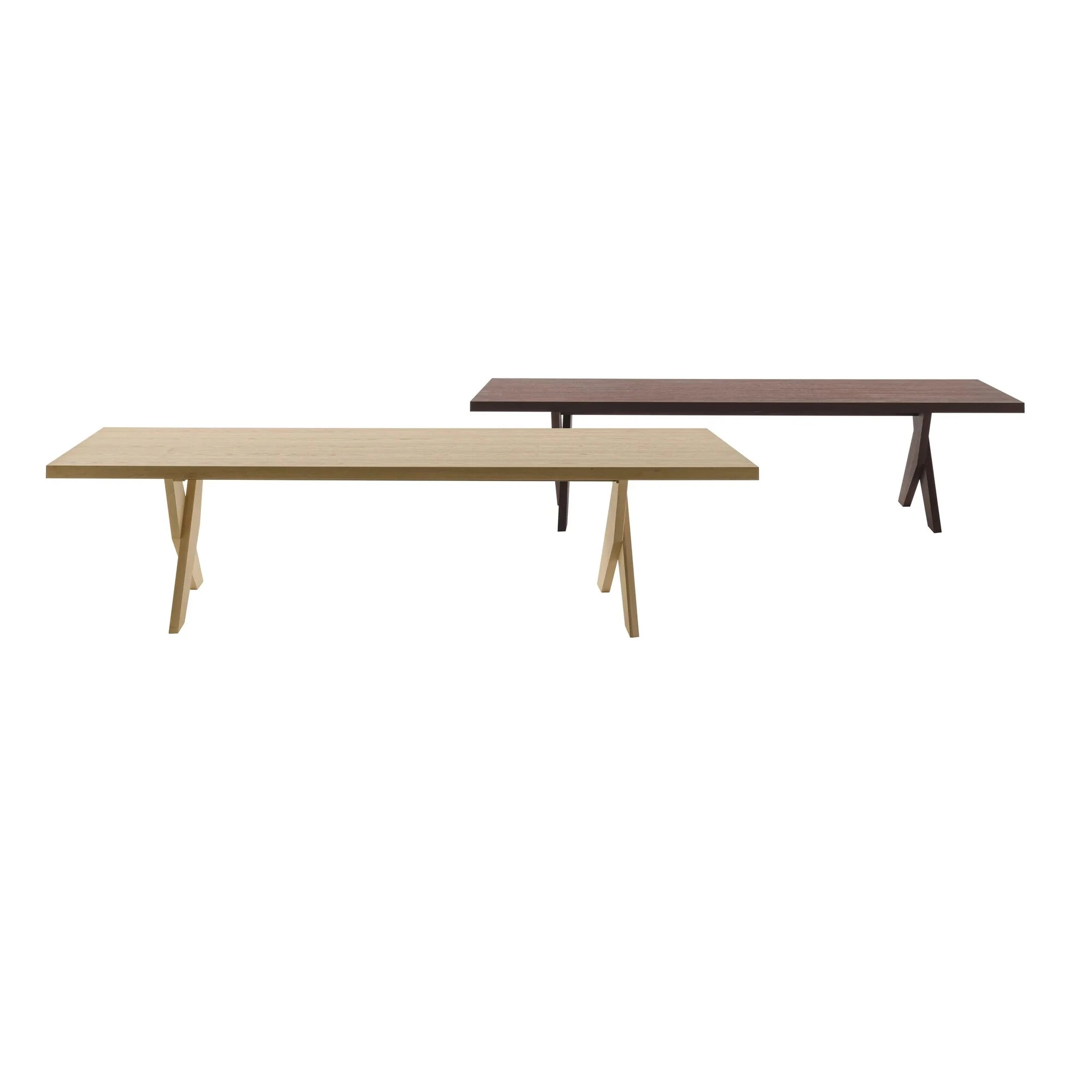 Mocna estetyka konstrukcji nóg z litego drewna w kształcie litery X, utworzonej z dwóch zachodzących na siebie kształtów, jest cechą charakterystyczną stołu Ares. Ten stół ma gruby prostokątny blat, który jest dostępny w dwóch rozmiarach i jest dostępny w kilku rodzajach drewna.