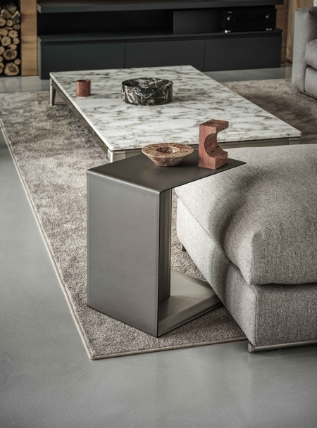 Dzięki swojej smukłej, uporządkowanej geometrycznej formie C, Plain jest praktycznym stolikiem tacy zaprojektowanym do umieszczenia obok lub przed sofą. Forma i funkcja łączą się harmonijnie, a jego uporządkowane linie stanowią doskonałe tło dla luksusowego materiału jak skóra krowia. Metalowa konstrukcja stolika bocznego Plain jest w całości obita skórą krowią, dostępną w szerokiej palecie kolorów Flexform.