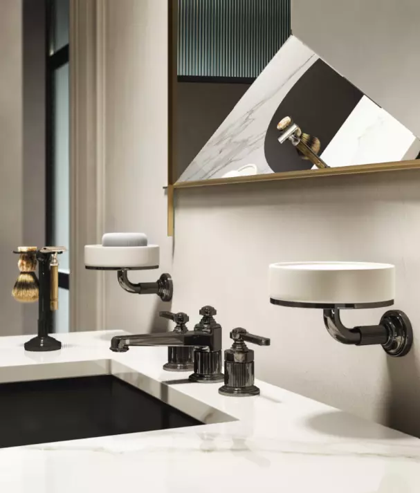 Czarny uchwyt na mydło naścienny. Kolekcja Venti20 wchłania entuzjazm do życia i optymizm patrzący w przyszłość tamtej epoki i wtapia go w najbardziej prywatne przestrzenie współczesnego życia.