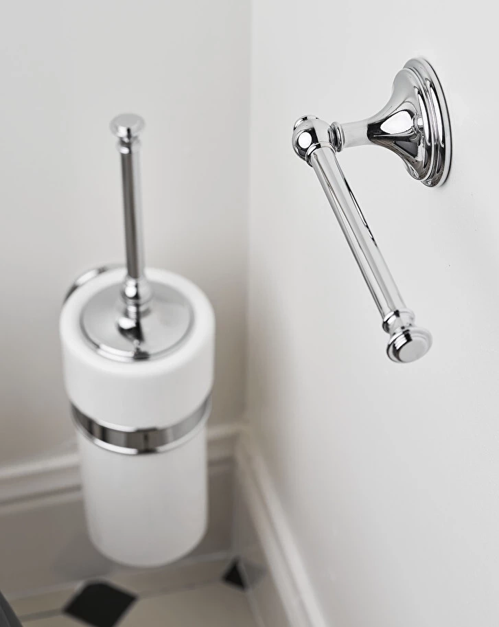 Wynikiem współpracy z wielkim protagonistą współczesnej architektury jest uchwyt na papier toaletowy z ceramiki zaprojektowany przez Massimo Iosa Ghiniego, idealny do łazienek o klasyczno-współczesnym smaku. Jego mosiężna struktura jest podkreślona wyrafinowanymi detalami o retro inspiracji.