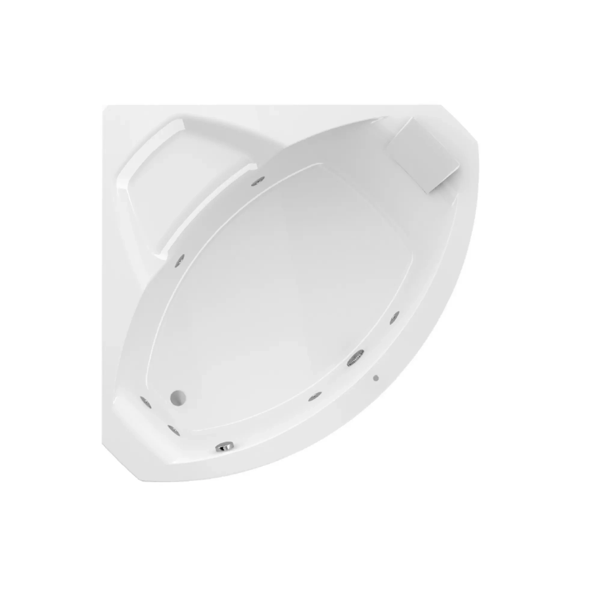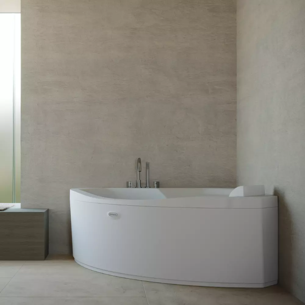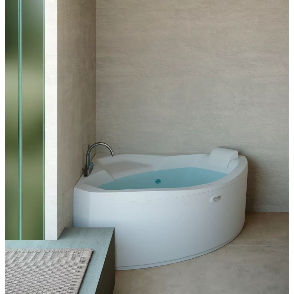 Wanna narożna zaprojektowana do skutecznej hydroterapii. Przestrzeń na brzegu może również być wygodnym miejscem do siedzenia.