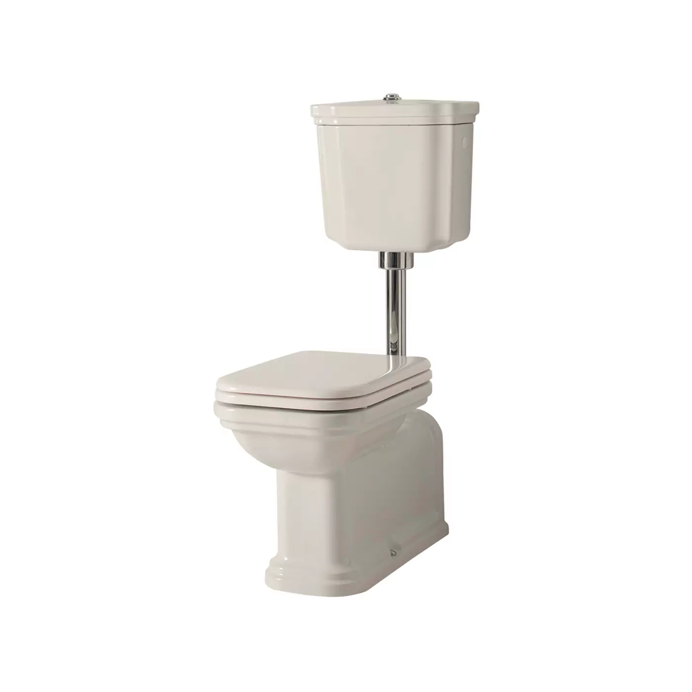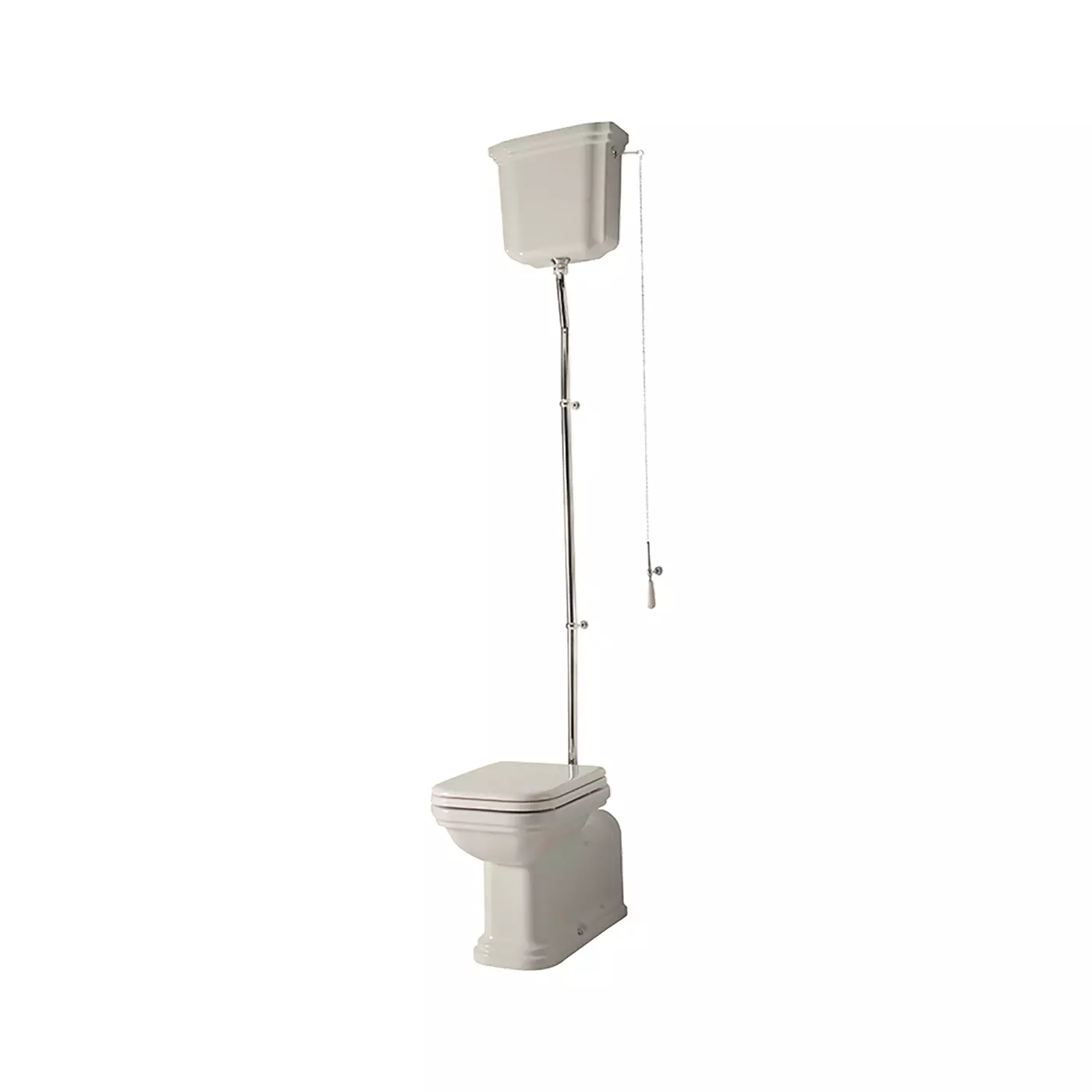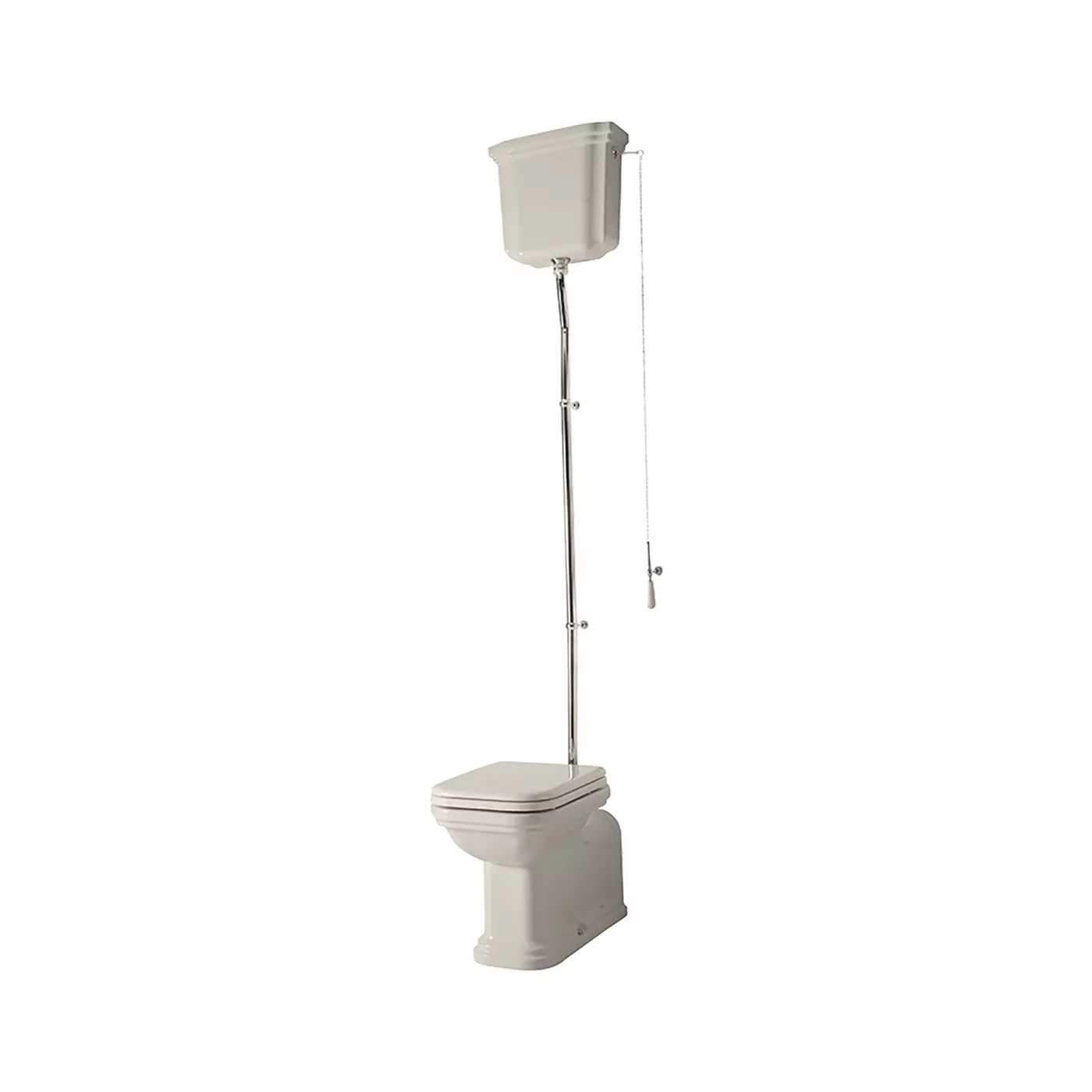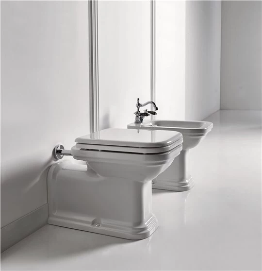Miska WC BTW "PROLUNGATO". Kształt wydłużonej toalety Waldorf z wysokim zbiornikiem nawiązuje do przeszłości i jest całkowicie inspirowany armaturą łazienkową zainstalowaną w historycznym hotelu Waldorf-Astoria w Nowym Jorku. Zaprojektowana przez Massimiliano Cicconiego, który promuje odrodzenie staromodnych linii, ta podłogowa toaleta z wysokim zbiornikiem wyróżnia się prostokątnym kształtem, zaokrąglonymi rogami i skrupulatną dbałością o każdy szczegół.