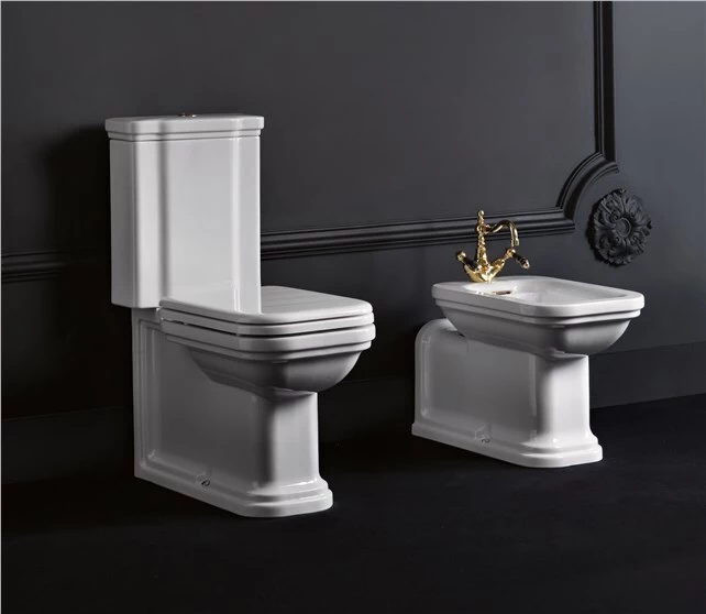 Miska WC podwieszana. Design tej podwieszanej miski WC jest liniowy, raczej schematyczny i zgodny z trendami charakterystycznymi dla stylu klasycznego. Jest montowana na podłodze, a nie zawieszana, jak te bardziej modne obecnie. Jest wyposażona w zbiornik, który opiera się o ścianę i staje się jednym elementem z toaletą poniżej. To wspaniałe i klasyczne urządzenie wykonane jest z białej porcelany i nie mogłoby być inaczej, ponieważ jest to materiał najwyższej jakości używany w przeszłości, ale wciąż powszechnie stosowany dzisiaj. Jego wyrafinowana elegancja zaskakuje dzięki lekko zaokrąglonym rogów i solidnej wielkości, które są nietypowe w bardziej modnych armaturach łazienkowych dzisiejszych czasów. Wybór podwieszanej miski WC z zbiornikiem z kolekcji Waldorf oznacza bycie niekonformistą. To nie tylko wybór stylu, ale także wybór płynący z serca, z melancholii, z pragnienia przywołania przeszłych atmosfer i oddania hołdu stylowi, którego elegancja na zawsze pozostanie wyrzeźbiona w świecie mody i wyposażenia wnętrz.