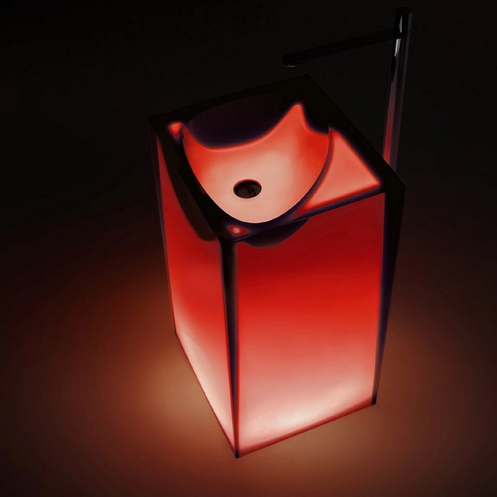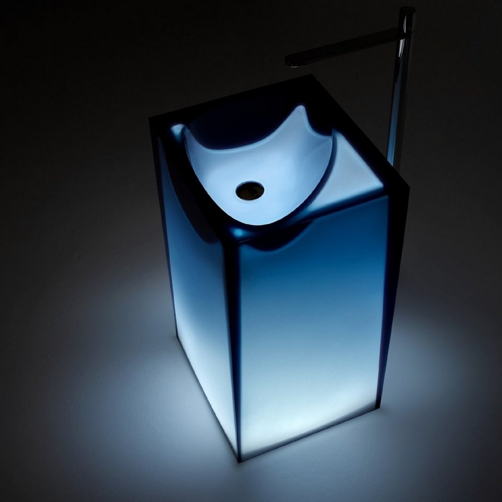 Wolnostojący zlew Cristalmood lub Icemood z odpływem podłogowym, z oświetleniem LED, dostępny w różnych kolorach zgodnie z naszymi próbkami, z matowym podstawą w komplecie z otwartym korkiem, syfonem i rurą. Wymiary: 85 cm x 45 cm x 50 cm.
