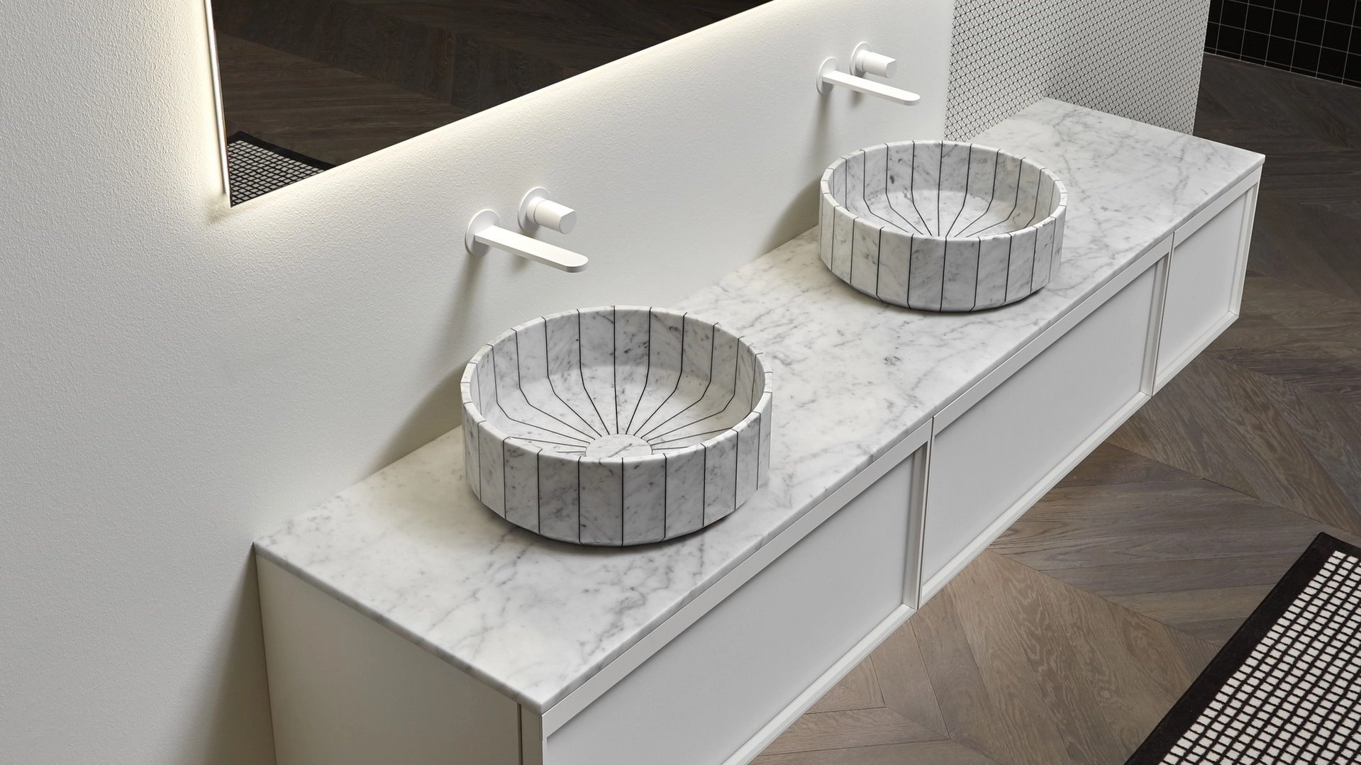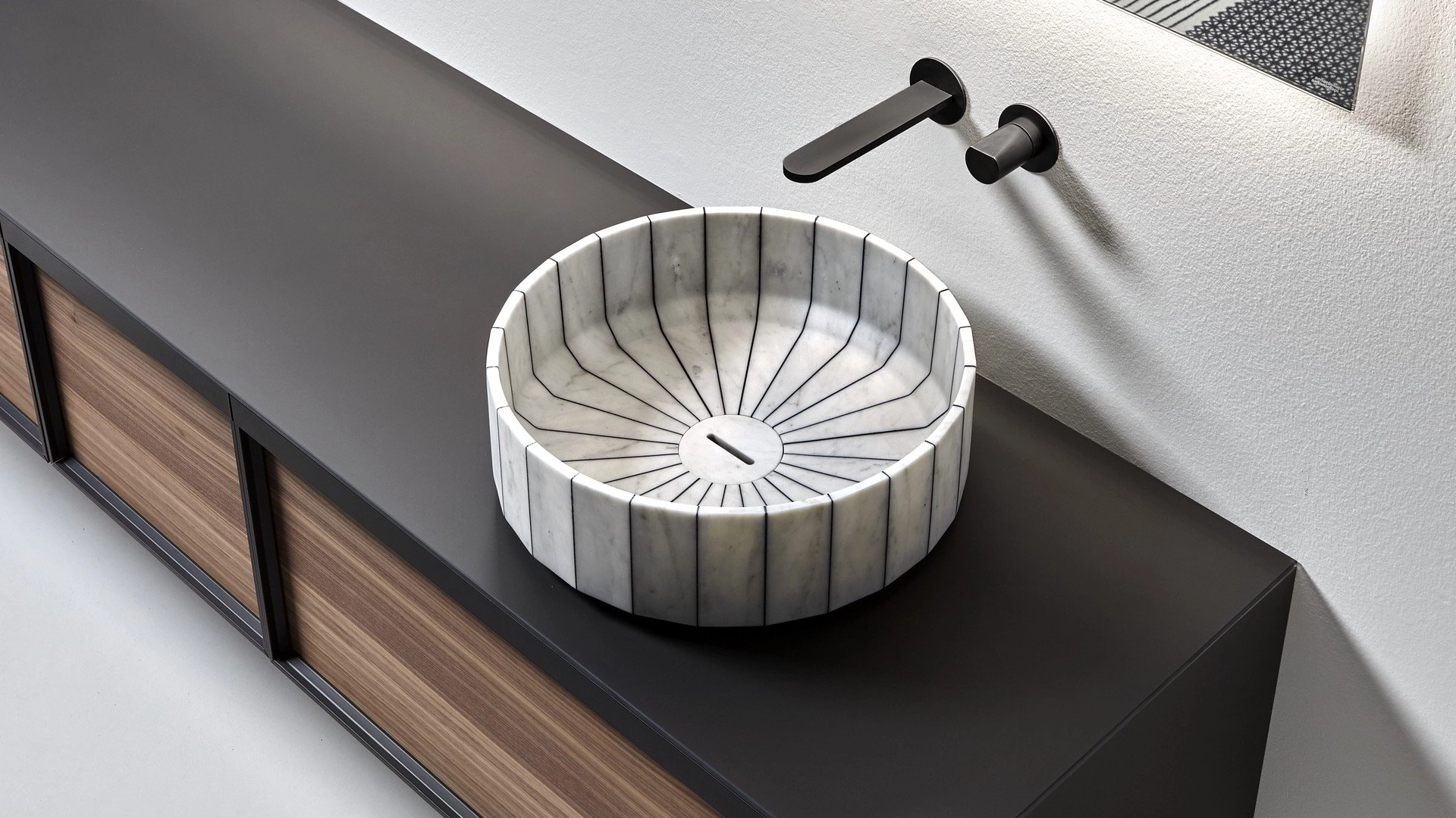 Jej obraz jest solidny i statutowy, jakby wyrzeźbiony z jednego bloku kamienia i wygładzony przez wodę. Jej wolumen jest natomiast generowany przez montaż poszczególnych segmentów, które są ze sobą połączone za pomocą czarnej lub białej żywicy. Fonte, umywalka na blacie, która nawiązuje do obrazu kamiennych umywalek tradycyjnie obecnych na obszarach wiejskich i górskich. Ciągłe odwoływanie się do mocy wody i jej znaczenia w regulowaniu życia człowieka, ciągły skok między przeszłością a teraźniejszością, między naturą a sztucznym, między nieskończonym potencjałem natury a myślą człowieka.